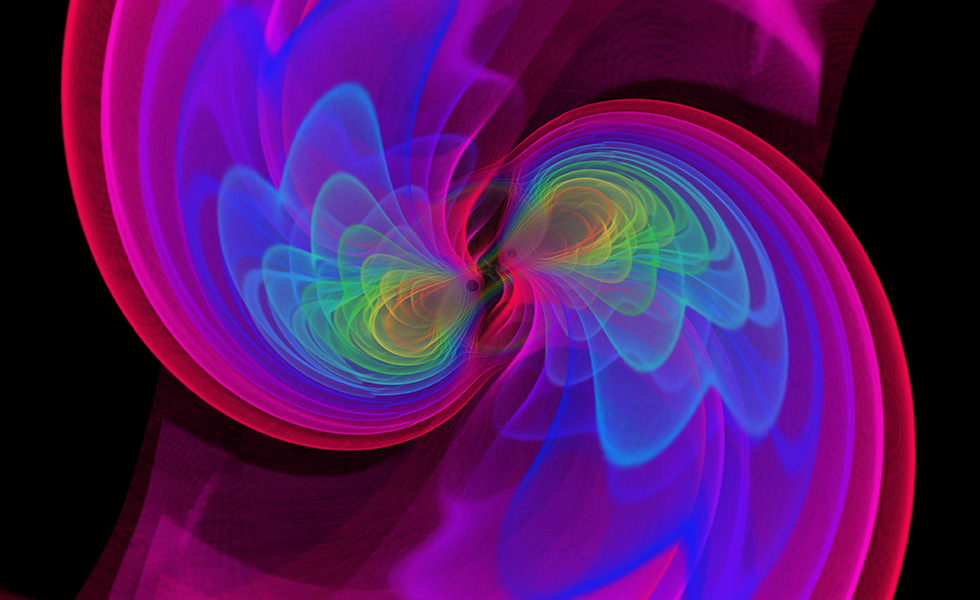 © Serguei Ossokine, Alessandra Buonanno/MPI für Gravitationsphysik, wissenschaftliche Visualisierung: Werner Benger/Airborne Hydro Mapping GmbH -