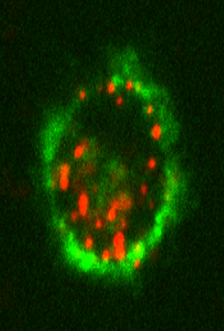 Querschnitt einer Langerhans-Zelle (Membran: grün, aufgenommene Nanopartikel: rot, Zellkern: blau). © MPI f. Kolloid- und Grenzflächenforschung/ Dongyoon Kim -
