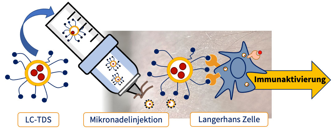 Der Langerin-spezifische Ligand ist der Kern des Langerhans Cell Targeted Delivery System (LC-TDS). Das modulare System umfasst neben dem Liganden ein Transportsystem (Vehikel), sowie die auszuliefernden Wirkstoffe, beziehungsweise Antigene (Cargo). Der Ligand ist ein kleines synthetisch erzeugtes Molekül, das in großer Zahl auf der Oberfläche des Carriers sitzt. Aufgrund seiner hohen Bindungsspezifität für Langerin sorgt er dafür, dass das Vehikel von den Langerhans-Zellen wie ein natürliches Pathogen wahrgenommen und verarbeitet wird. Als Vehikel dienen Liposomen, Proteine, LNPs (Lipidnanopartikel) oder andere Mikropartikel. Studien an epidermalen Zell-Suspensionen als auch an menschlichen Hautexplantaten haben gezeigt, dass das LC-TDS von 97 Prozent der Langerhans-Zellen aufgenommen wird; wohingegen nur 0,1 Prozent andere, sogenannte Off-Target-Zellen, adressiert wurden. Diese hohe Spezifität und Selektivität erlauben einen äußerst gezielten Transport der mitgeführten Wirkstoffe. Als Cargos können kleine Moleküle, Peptide, Proteine oder mRNA eingesetzt werden. Da die adressierten Langerhans-Zellen in der obersten Hautschicht sitzen, lässt sich das LC-TDS über minimal-invasive Mikronadeln verabreichen.
