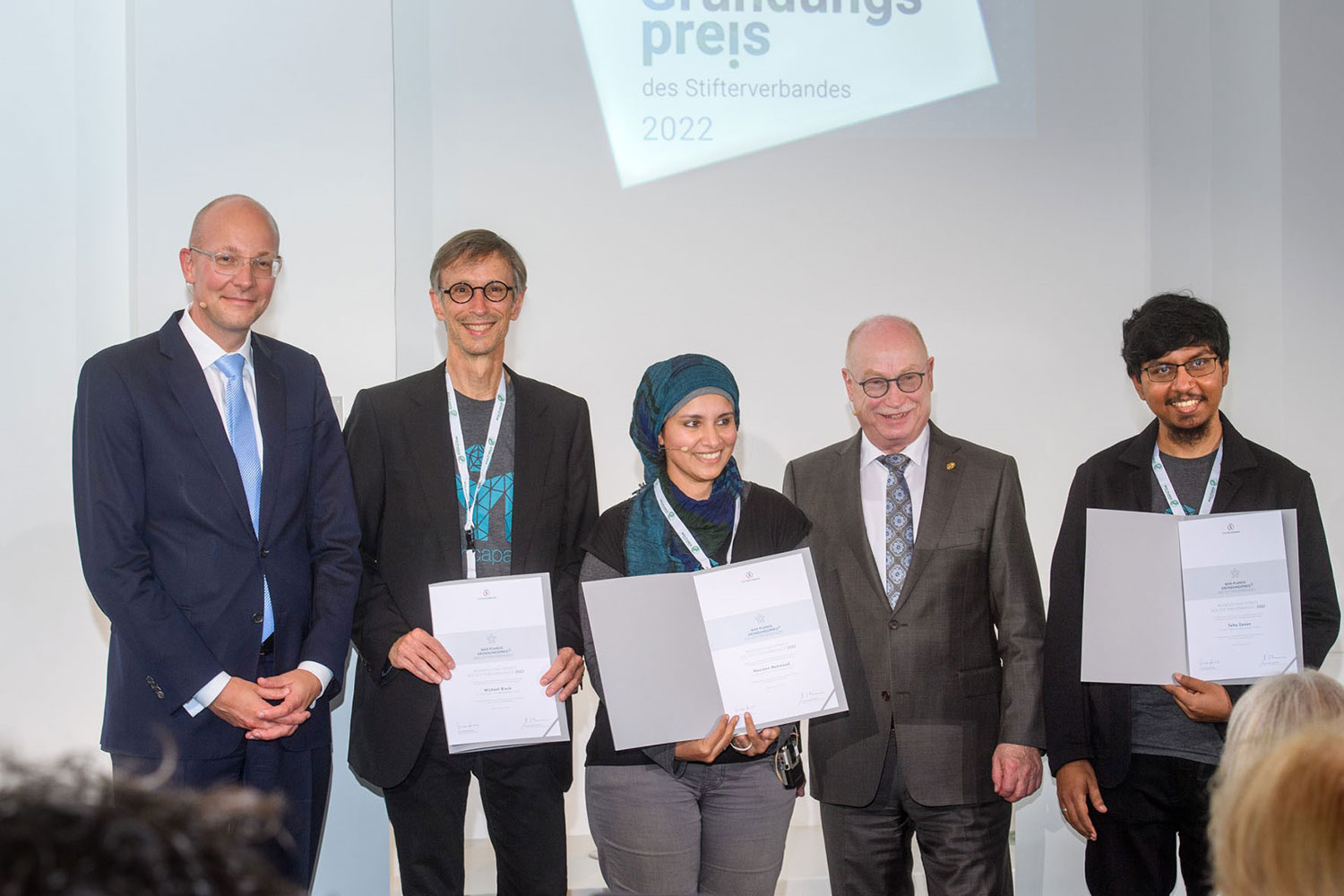 Begaben sich gemeinsam auf die spannende Reise, das Startup Meshcapade zu gründen (v.l.n.r.): Michael Black, Direktor am MPI für Intelligente Systeme, Florian Kirschenhofer, Senior Start-up und Portfolio Manager bei Max-Planck-Innovation, Naureen Mahmood, Chief Executive Officer von Meshcapade, und Talha Zaman, Chief Technology Officer von Meshcapade, bei der Verleihung des neu konzipierten Max-Planck-Gründungspreises des Stifterverbands 2022. © Max-Planck-Gesellschaft / David Ausserhofer -