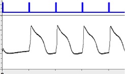 Diagramm: Das durch Licht angeregte Schlagen von Herzmuskelzellen im Laborversuch. Die Lichtblitze (blaue Linie) regen das Schlagen der Herzzellen und die elektrische Aktivität an, die mittels eines für elektrische Spannung empfindlichen Farbstoffs beobachtet werden kann. © Photoswitch Biosciences Incorporated